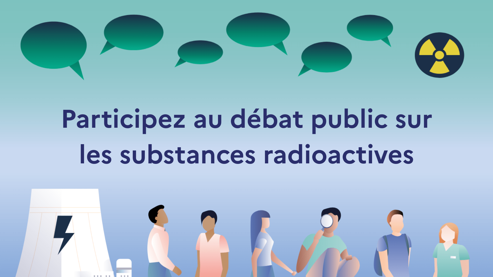 Au centre du visuel, il est écrit : « Participez au débat public sur les substances radioactives ». Au-dessus du texte, il y a plusieurs bulles de parole et le symbole qui représente les substances radioactives. En bas, il y a une illustration de centrale nucléaire. À côté, plusieurs personnages représentent les citoyens.