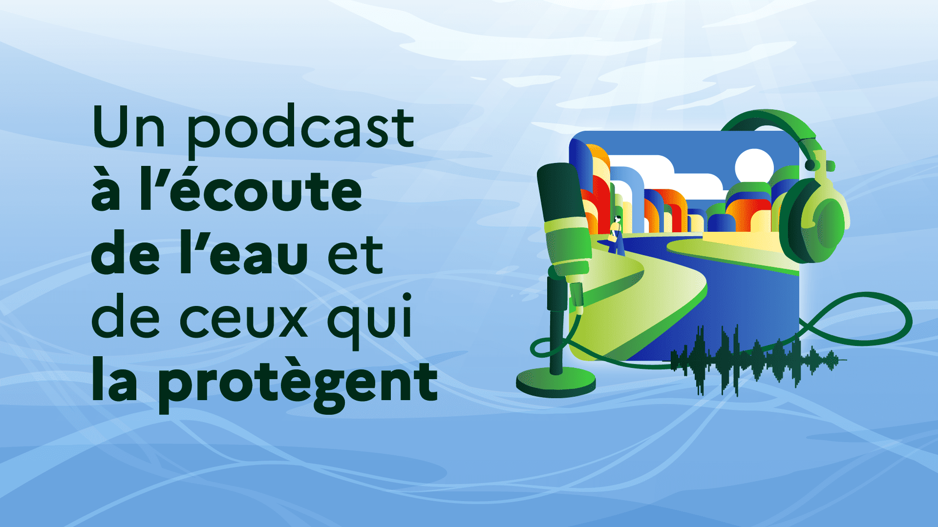 Sur la gauche, on lit : « Un podcast à l’écoute de l’eau et de ceux qui la protègent ». À droite de l’image, on voit une vignette carrée arrondie de la couverture de la saison 3 du podcast « En immersion » redessinée. On voit également un casque audio en équilibre sur un coin de la vignette, avec un micro en premier plan et une onde audio. En fond, on donne l’impression d’être sous l’eau pour faire référence à « l’immersion ».