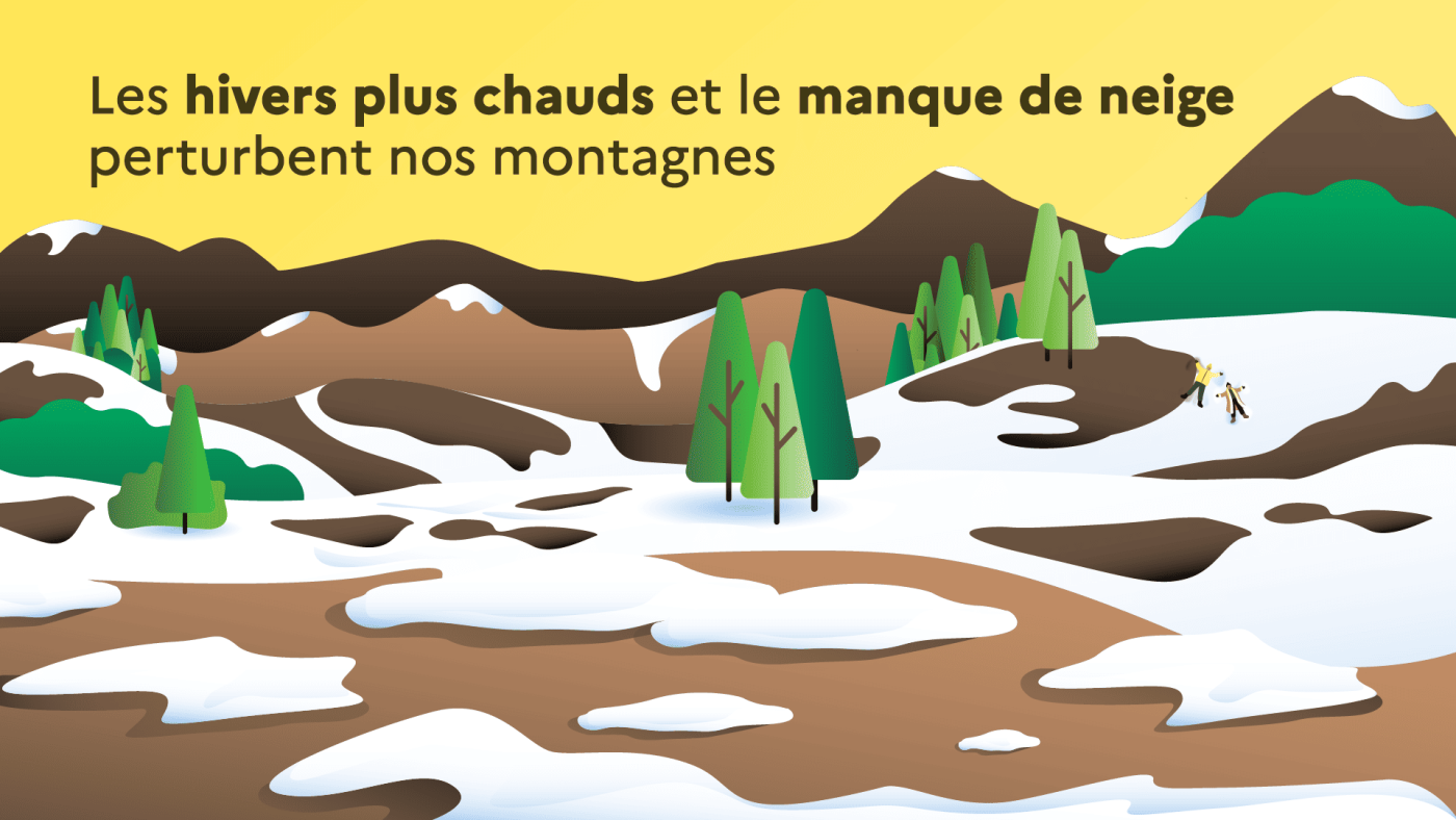 Illustration représentant un paysage composé de quelques collines peu enneigées et de quelques arbres verts. En arrière plan des montages dont seuls les sommets sont enneigés. Sur le flanc d’une des collines, à droite, on aperçoit deux personnes étendues dans la neige. Dans le ciel, on peut lire : « Les hivers plus chauds et le manque de neige perturbent nos montagnes ».