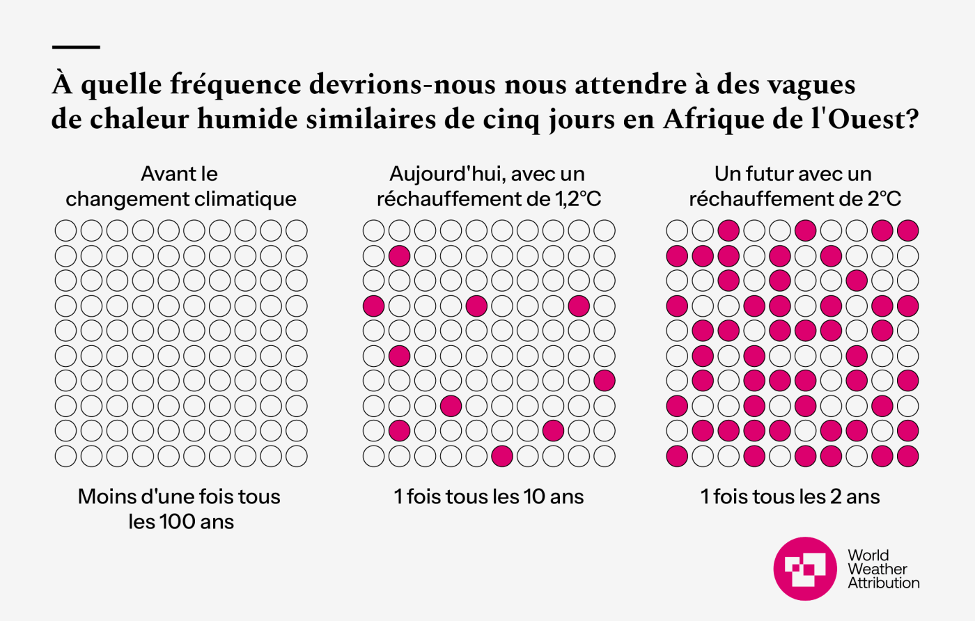 Agrandir la figure 4848En haut du visuel il est écrit : « À quelle fréquence devrions-nous nous attendre à des vagues de chaleur humide similaires de cinq jours en Afrique de l’Ouest ? ». Le schéma montre 3 grilles de 100 points, dont certains sont remplis en rose pour représenter la fréquence des évènements. Sur la première grille, tous les points sont vides. Il est écrit « Avant le changement climatique – Moins d’une fois tous les 100 ans ». Sur la deuxième grille, 10 points sur 100 sont remplis. Il est écrit « Aujourd’hui, avec un réchauffement d’1.2 °C – 1 fois tous les 10 ans ». Sur la troisième grille, la moitié des points sont roses. Il est écrit « Un futur avec un réchauffement de 2 °C – 1 fois tous les 2 ans ».