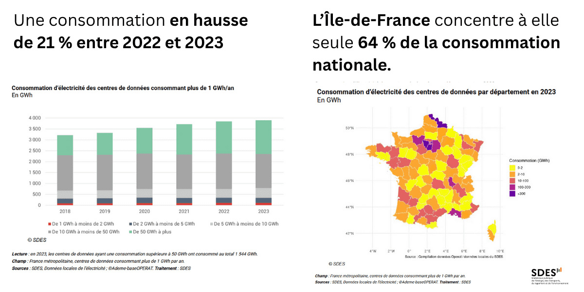 Entre 2022 et 2023, leur consommation a augmenté de 21 %. Cette hausse est due aux plus gros sites : les datacenters dépassant 50 gigawattheure (GWh) par an ont vu leur consommation bondir de 69 %. Cette tendance s’explique par l’augmentation des besoins en stockage, en calcul et en services numériques.