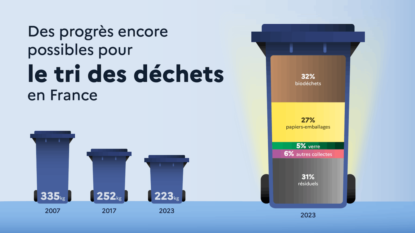 Sur la gauche de l’image, on lit :« Des progrès encore possibles pour le tri des déchets en France. » Sous ce texte, trois poubelles montrent la quantité de déchets produits en 2007, 2017 et 2023. À droite, un bac gris montre les objets qui ont été jetés par erreur en 2023 alors qu’ils auraient pu être recyclés ou jetés dans d’autres bacs.