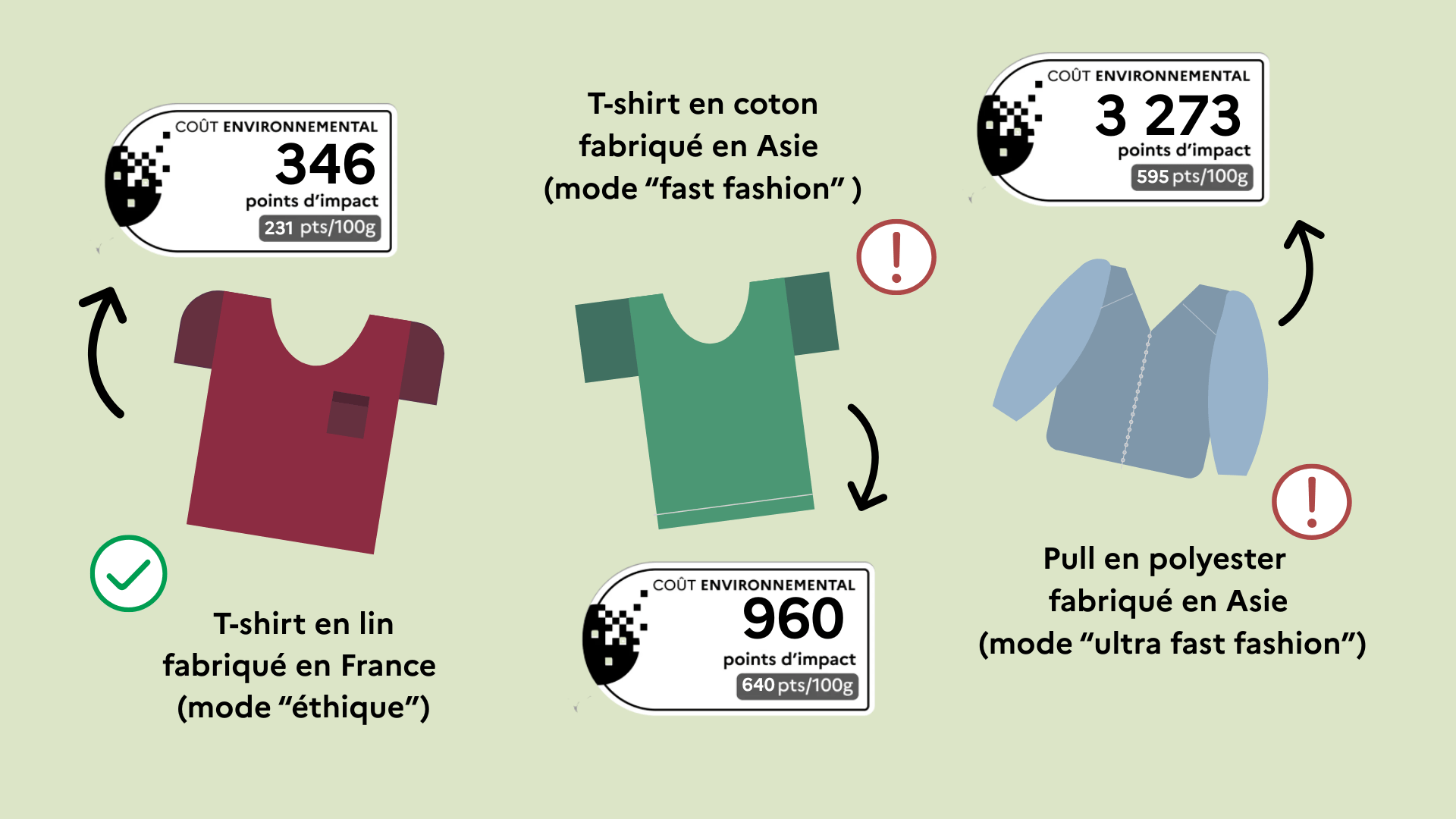 Le visuel montre trois vêtements différents accompagnés de leur étiquette « Coût environnemental ». Le premier est un t-shirt vert en lin fabriqué en France (mode « éthique ») et affiche 346 points d’impact (231 points/100 g). Le deuxième est un t-shirt rouge en coton fabriqué en Chine (mode fast fashion) et affiche 960 points d’impact (640 points/100 g). Le troisième est un pull bleu en polyester fabriqué en Asie (mode ultra fast fashion) et affiche 3 273 points d’impacts (595 points/100 g). À côté du premier t-shirt, il y a une coche verte. À côté des deux autres articles figure un point d’exclamation rouge.