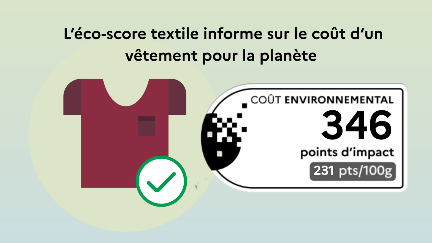 Le visuel montre un t-shirt rouge accompagné d’une étiquette éco-score textile qui affiche 346 points d’impact. Sur le t-shirt, il y a une coche verte. Au-dessus, il est écrit : « L’éco-score textile informe sur le coût d’un vêtement pour la planète ».