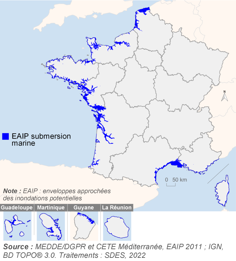 Les territoires français pouvant être confrontés au phénomène de submersion marine couvrent 11 100 km2. Les communes littorales concentrent 66 % de ces territoires (soit 7 300 km2) dont plus de la moitié est située dans les départements des Bouche du Rhône, la Vendée, la Charente-Maritime et en Guyane.