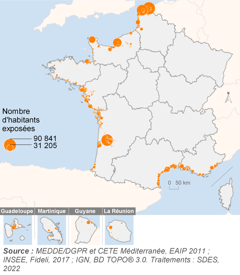 Environ 1,5 million de personnes résident dans des zones potentiellement exposées à l’aléa inondation par submersion marine. 67 % d’entre elles habitent dans les communes littorales métropolitaines et 6 % dans les communes littorales ultramarines. Les 27% restants sont localisés dans des communes estuariennes, non soumis à la loi littorale, situées principalement sur les rivages de l’estuaire de la Gironde, de la Loire et de la Seine.