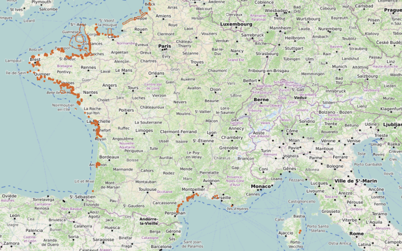 Sur la période 2018-2020, les dénombrements d’Escherichia coli ont permis d’évaluer la qualité microbiologique de 397 points du littoral français métropolitain, répartis sur 302 zones de production conchylicoles (une zone pouvant être suivie par un ou plusieurs points de surveillance) : 125 points surveillent les zones de production des bivalves fouisseurs (coques, palourdes, …) et 272 points les zones de production des bivalves non fouisseurs (huîtres et moules).