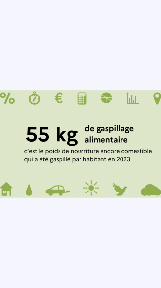 En France, les pertes alimentaires, du champ à l’assiette, sont estimées à près de 150 kg par an par habitant, dont un tiers perdus chez le consommateur lui-même. Ces produits perdus ou gaspillés seraient à l’origine de 15 millions de tonnes équivalent CO2par an soit 5% des émissions annuelles nationales.