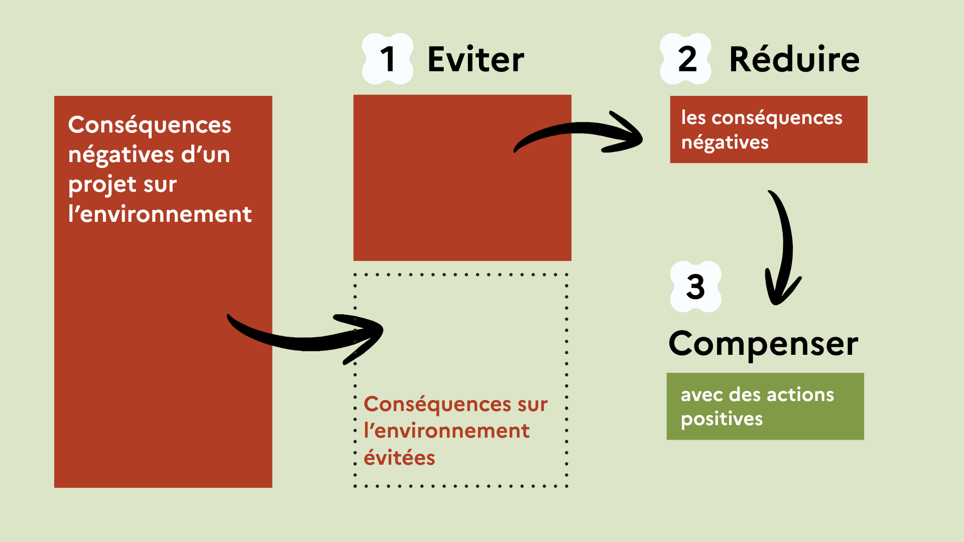 À gauche du visuel, il y a un grand rectangle rouge sur lequel il est écrit « Conséquences négatives d’un projet sur l’environnement ». Une flèche pointe vers un autre rectangle rouge, plus petit que le premier, et un encadré en pointillés qui représente la différence avec le premier rectangle. Au-dessus, il est écrit « 1. Eviter ». Une deuxième flèche pointe vers un autre rectangle rouge, encore plus petit. Il est écrit « 2. Réduire les conséquences négatives ». Une troisième flèche pointe vers un rectangle vert de la même taille que le dernier rectangle rouge (les effets négatifs qui n’ont pu être évités, ni suffisamment réduits). Il est écrit : « 3. Compenser avec des actions positives ».