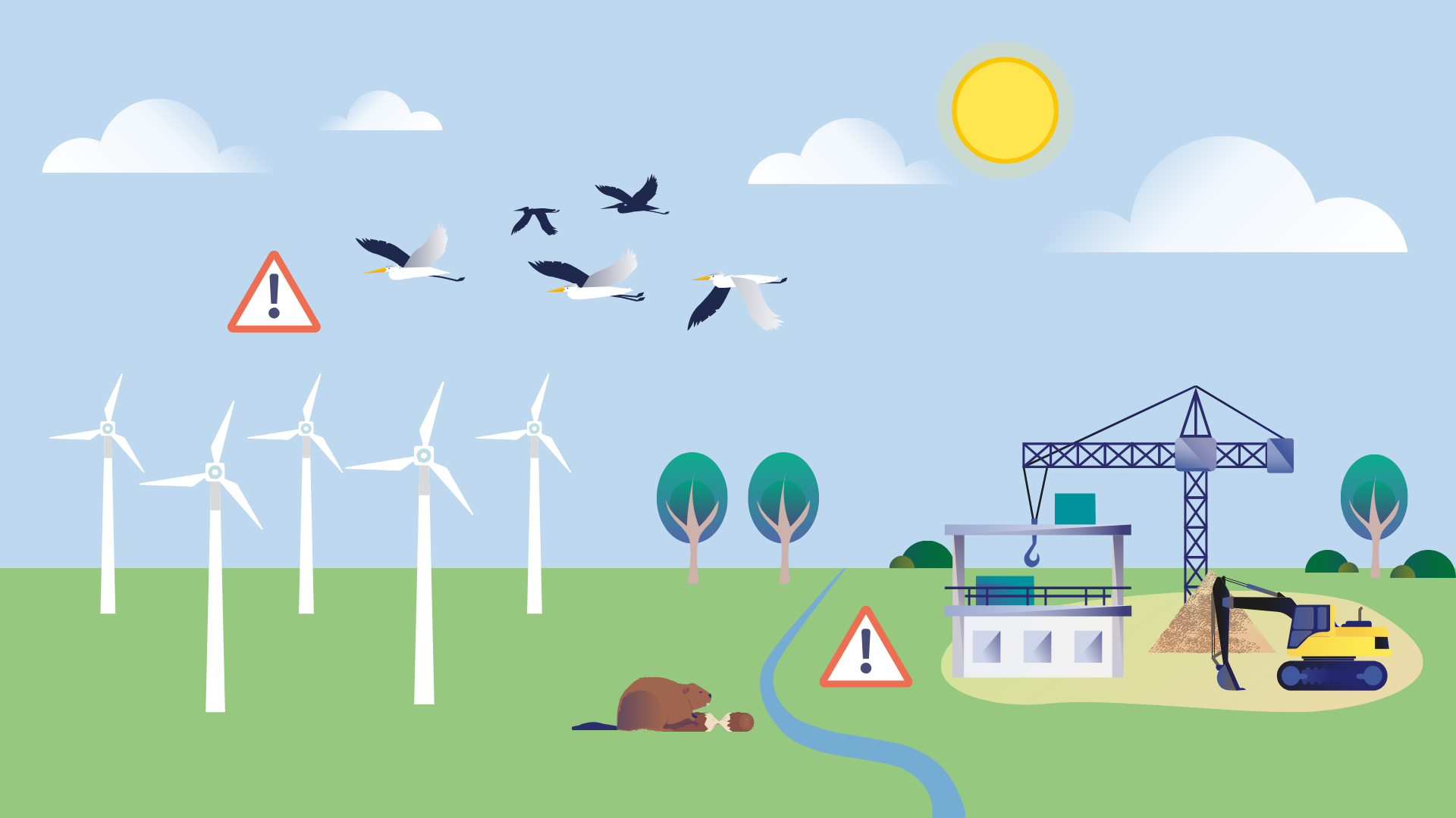 Le visuel montre un paysage. D’un côté, il y a des oiseaux qui volent au-dessus d’un champ d’éoliennes. De l’autre côté, il y a un chantier de construction entouré d’arbres, d’un cours d’eau et d’un castor.