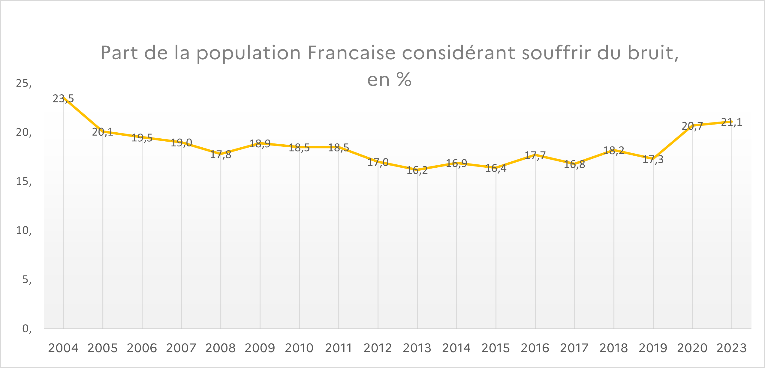 D’après un sondage réalisé par EUROSTAT, plus de 1 Français sur 5 estime souffrir du bruit en 2023. Ce sentiment de gêne lié aux nuisances sonores a assez nettement diminué entre 2004 et 2019 avant de réaugmenter depuis 2020.