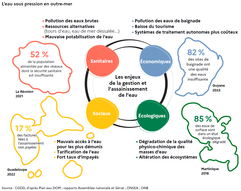 Dans les DROM, la part de la population non raccordée à une station d’épuration dépasse souvent les 50 %. Le niveau de vie empêche les habitants d’investir dans un système d’assainissement efficace ou dans son entretien. La quasi-totalité des équipements individuels qui existent ne fonctionne pas correctement.